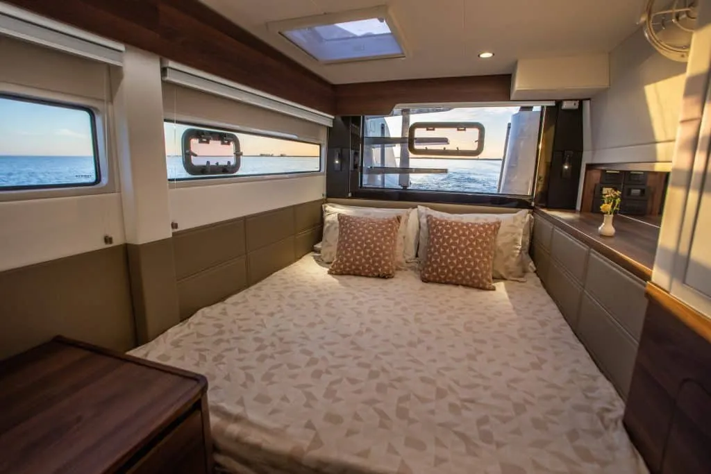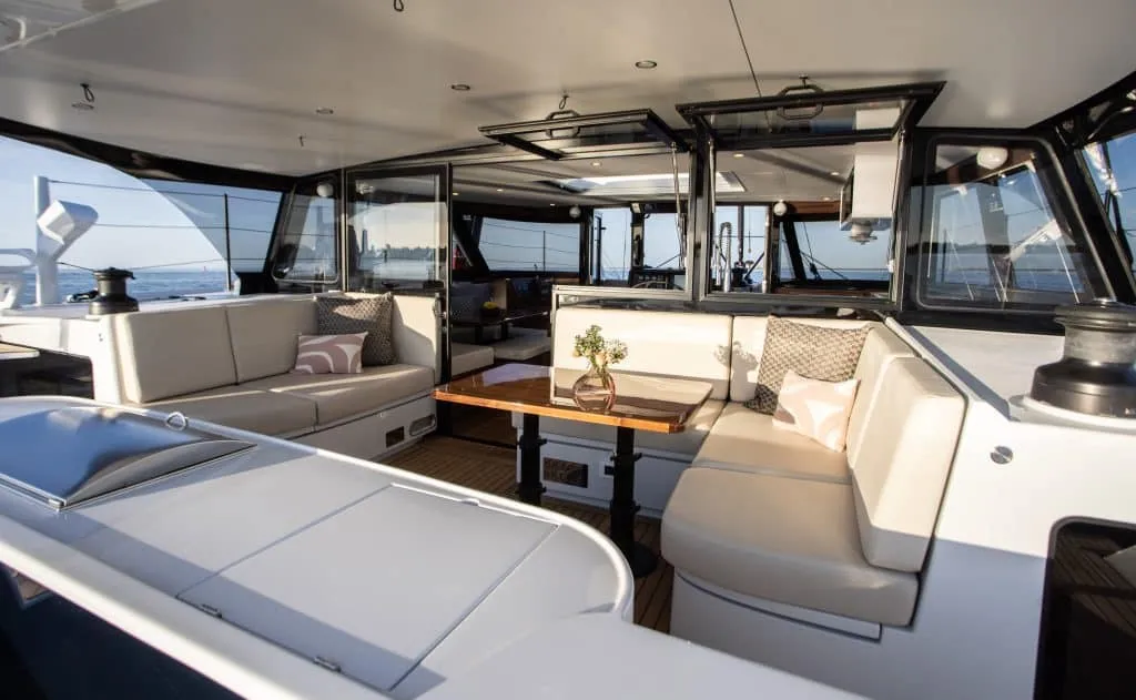 With helms at both aft quarters of the yacht, all sail controls are led back to the twin winches at each helm station through line tunnels under deck, keeping the side decks free of clutter. A fold out helm seat is available at each location, out of the way for everyday living and there when you need it. Without the forward cockpit, the salon and galley are larger, with ventilation coming from the two large forward opening windows and the refinement of a modern apartment, complete with an island galley, large navigation table and seating for six or more at each of the two tables. If you are looking for a luxurious yet enthralling cruising catamaran, look no further.