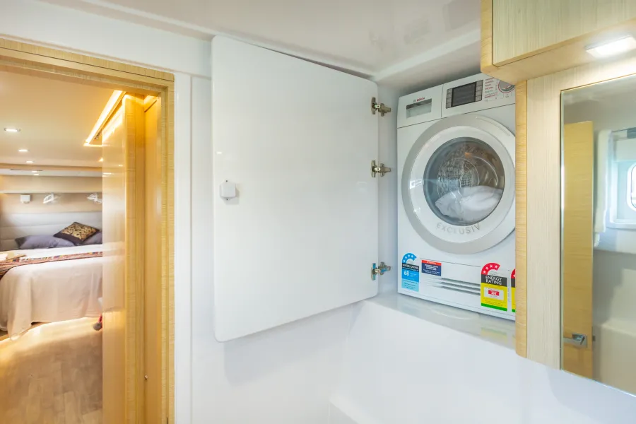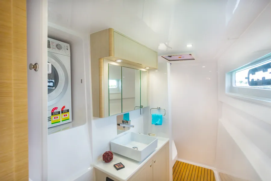 With options of a 3 or 4 cabin layout, she can comfortably sleep 8-10 people. In the owners version 3 cabin layout, with the owners to starboard, there is a queen size bed, desk and dressing area with a full size bathroom. The port hull contains another queen berth cabin as well as a cabin with 2 single berths which can be converted to a double and another bathroom.