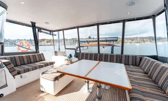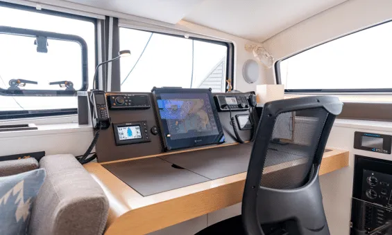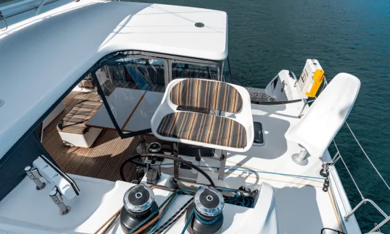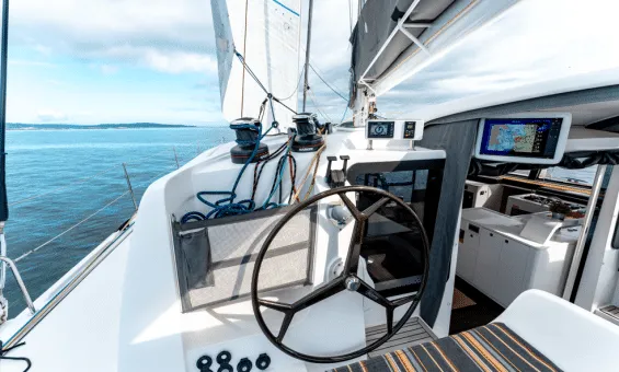 Even with this focus on performance, Wikiwiki’s power is easily managed by a couple from the comfortable and protected helm stations. For the ultimate in on-the-water sensations, the sailing enthusiast can choose to helm from the Formula One style chairs with the upgraded carbon tillers.