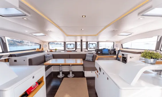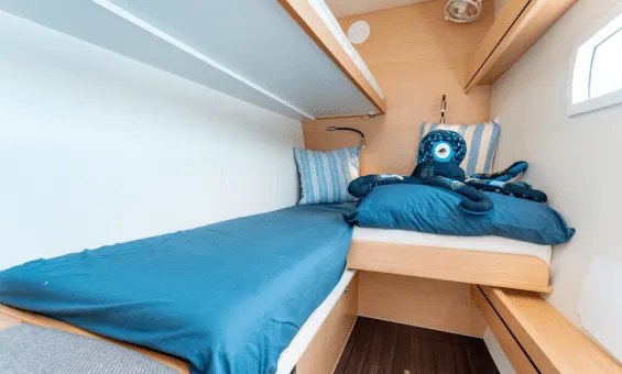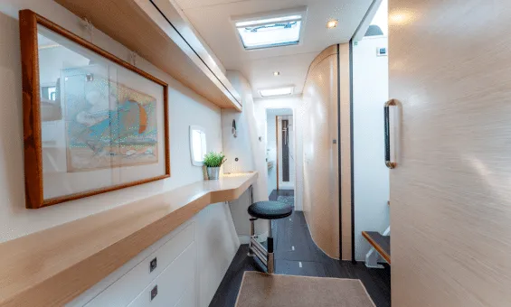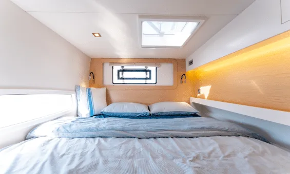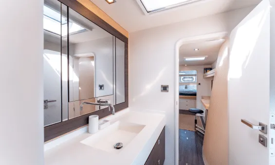 Of course, all this speed is no good if the family is not comfortable ! This is an owner’s version with the port hull dedicated to the owners’ well-being: large bed aft, desk amidships and the expansive toilet and shower area forward. The starboard side features two cabins with the forward cabin flexible as bunks or a queen configuration and a queen guest cabin aft. The large salon and galley offer great sightlines and plenty of ventilation. Travel to the cockpit is seam less and the cockpit offers a safe and comfortable place to live whether at anchor or underway.