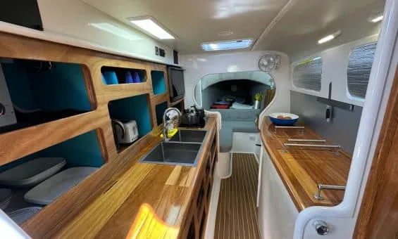 - Polished timber saloon table and flat areas.